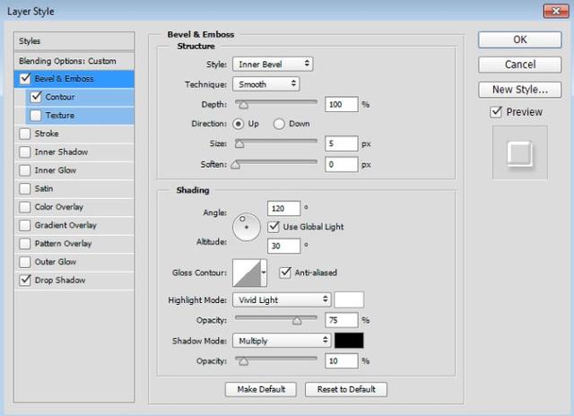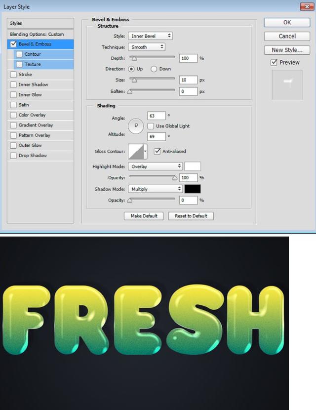 双击第一个复制文本图层名称的右侧,打开图层样式对话框。选择左侧的斜角和浮雕,将尺寸更改为10 px,取消选中使用全局光,并使角度63°和海拔高度69°。选中防锯齿框,将高光模式更改为覆盖,将高光模式不透明度更改为100%,将阴影模式不透明度更改为0%。单击确定以应用图层样式。这将为文本添加另一个光面图层。