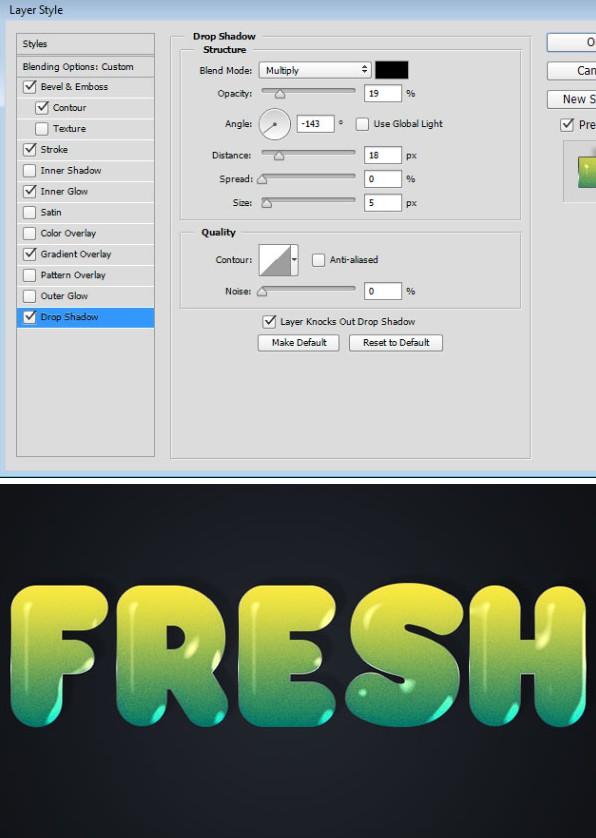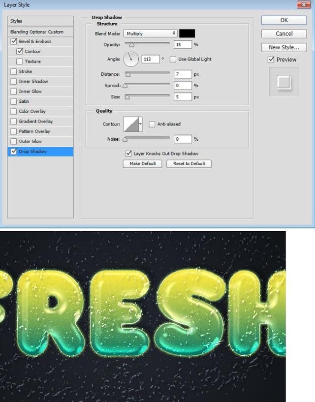 单击投影,将不透明度降低到15%,取消选中使用全局光,将角度更改为113°,并将距离设置为7像素。单击确定以应用图层样式。这种风格的滴式和融合良好的文字。
