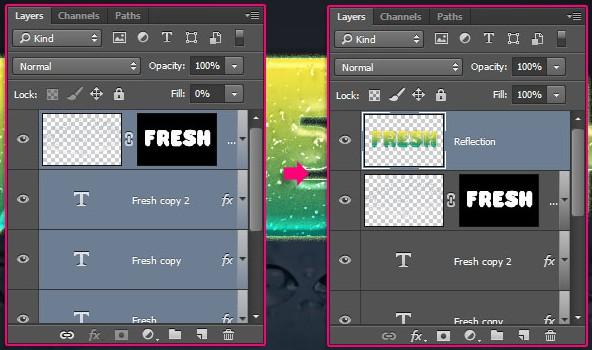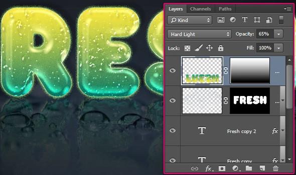 将反射层的混合模式更改为强光,并将不透明度降低到65%。然后,按照步骤六中第二段和第三段中的相同方向擦除反射的下半部分,并使用图层蒙版和渐变使其淡出。确保从底部将梯度拖到非反射字母的上方以获得正确的淡入淡出效果。