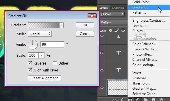 单击“图层”面板底部的“创建新调整图层”图标(半黑色,半白色圆圈),然后选择“渐变”。在“渐变填充”对话框中,单击渐变缩略图,双击左下角的色标,输入#7c7c7c,然后单击确定关闭拾色器。现在双击右下角的停止点,使用相同的颜色,然后单击确定两次。返回到渐变填充对话框,将样式更改为径向,缩放至500%,选中反转,然后单击确定。