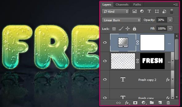 最后,将调整图层的混合模式更改为线性刻录,并将不透明度降低到30%。这将通过略微调整颜色来完成文字效果。
