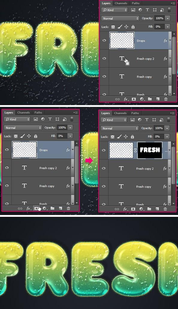 按住Command键并单击(PC:按住Ctrl键单击)文本图层的缩略图,将其作为选区加载,然后单击“图层”面板底部的“添加图层蒙版”图标(正方形中的圆形)。这将消除文本之外的所有额外滴,但您仍然可以删除该面具并将其重新应用于您创建的任何其他文本。