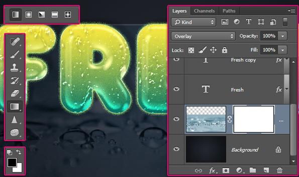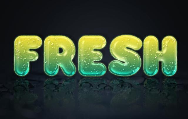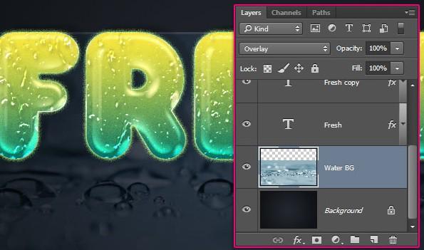 在Gex78文件夹中打开一个水滴图像(任何图像都可以使用)。使用“移动”工具,将图像拖放到工作文件中,然后将其拖放到原始文本图层下方。双击该图层的名称并将其重命名为Water BG。在“图层”面板的顶部,将混合模式更改为覆盖。选择“编辑”>“自由变换”并调整图像大小,使其稍微延伸至文本后面。