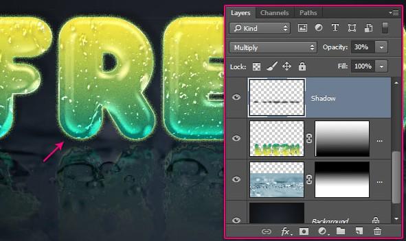 将阴影图层的混合模式更改为“正片叠底”并将“不透明度”降低至30%。现在在文本下面画一些阴影。如果您需要添加阴影后,您可以更改不透明度值。
