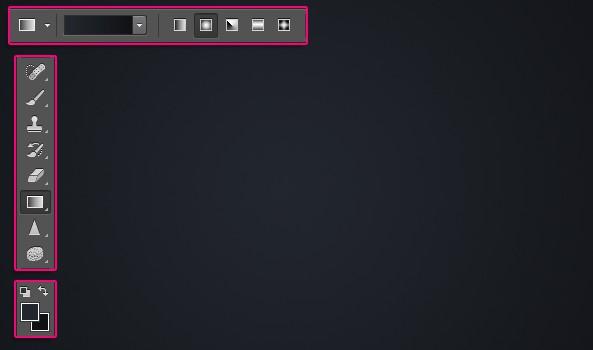 以72 ppi创建一个新的850×550像素文件。单击前景色样本并将前景色设置为#22272d,然后将背景色设置为#101115。选择渐变工具(G),单击选项栏中的渐变缩略图以打开渐变编辑器,单击前景到背景渐变,然后单击确定。现在单击选项栏中的径向渐变图标。从文档中心单击并拖动到其中一个角落以创建背景渐变。