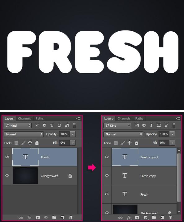 选择文字工具(T),并使用230磅处的弗兰克字体,在文档的中心键入白色字“FRESH”。将文本图层的填充值更改为0%,然后按Command-J(PC:Ctrl-J)两次以制作两个副本