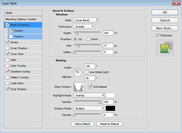 双击原始文本图层名称的右侧,弹出图层样式对话框。在左侧的样式列表中单击斜角和浮雕。将大小设置为27 px,取消选中使用全局光,将角度设置为149°,将海拔高度设置为58°。单击“光面轮廓”缩略图旁边向下的箭头,然后选择“圆锥 - 倒置”。选中防锯齿框,将高亮模式更改为叠加,使高光模式不透明度为100%,并将阴影模式不透明度更改为0%。