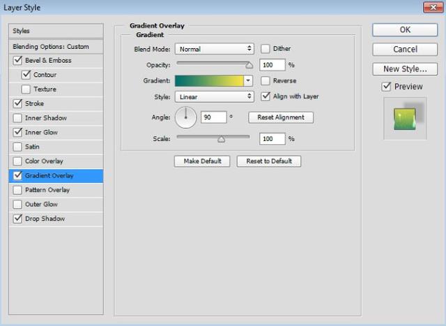 从样式列表中选择渐变叠加,然后单击渐变缩略图打开渐变编辑器。单击渐变斜坡左下方的黑色停止点,然后单击色样,将颜色设置为#016f6e,然后单击确定关闭拾色器。现在单击右下角的颜色停止,将颜色更改为#fee847,单击确定关闭颜色选择器,然后再次单击确定以关闭渐变编辑器。