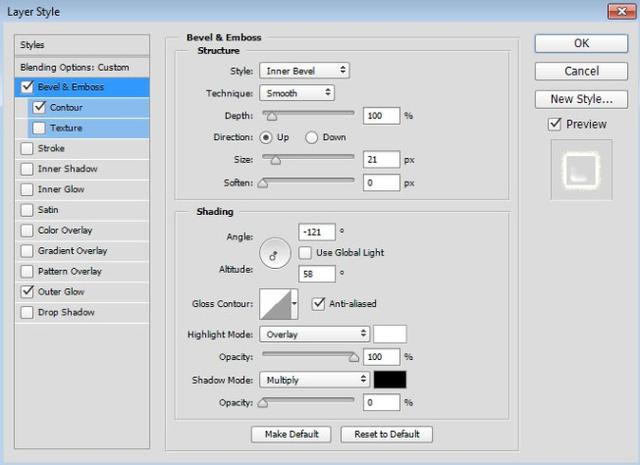 双击第二个复制文本图层,弹出图层样式对话框。单击斜角和浮雕,将大小设置为21像素,取消选中使用全局光,并将角度更改为-121°,将高度更改为58°。现在选中Anti-aliased框,将高亮模式改为叠加,将高光模式不透明度设置为100%,并将阴影模式不透明度更改为0%。