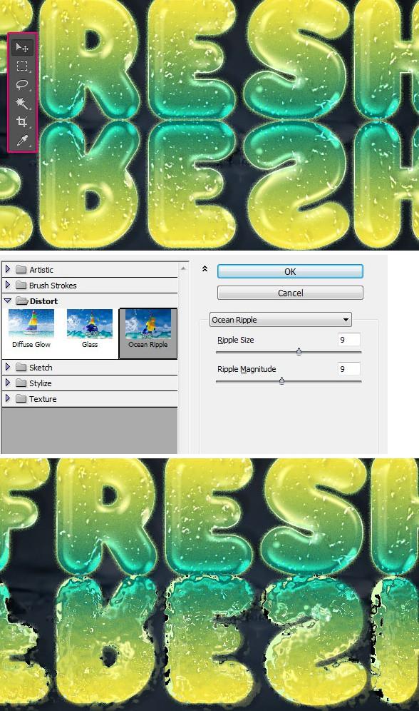 转到编辑>变换>垂直翻转以颠倒合并的图层。使用“移动”工具,按住Shift键并单击并向下拖动反射,直到其接触文本的底部边缘。选择“滤镜”>“滤镜库”>“扭曲”>“海洋波纹”,然后将这两个值都更改为9.这会使反射看起来更逼真