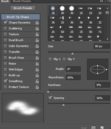 单击“图层”面板底部的“创建新图层”图标以在反射图层上添加图层。重命名图层阴影,单击前景色样本,为颜色选择#464646,然后单击确定关闭颜色选择器。选择画笔工具(B)并打开画笔面板(窗口>画笔)。使用左侧选择的笔尖形状,将大小设置为80像素,圆度设置为50%,间距设置为50%。现在单击形状动力学,将大小抖动更改为30%,并确保所有实例的控制设置为关闭。