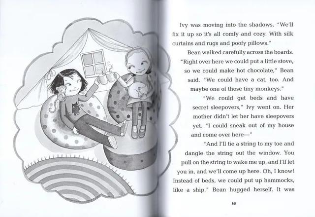书中插图简洁传神 :书的插画师Sophie Blackall将Bean、Ivy两个小女孩儿古灵精怪的形象,刻画得惟妙惟肖,生动传神。他们吐舌头、发呆幻想、四目相对、对视一笑……这些画面都增添了故事的趣味性,也帮助读者更好的理解故事内容。