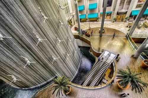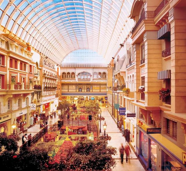 购物中心以古罗马集市为题材,地面满铺华美的大理石地板,室内还有巨大喷泉、遍布白色罗马列柱、露天咖啡座还有随处可见的绿植和雕塑。