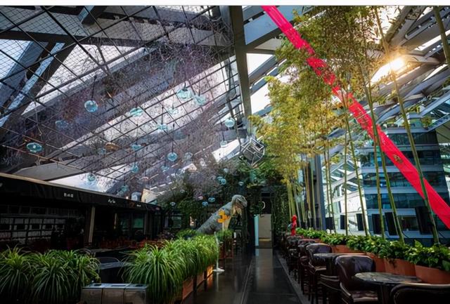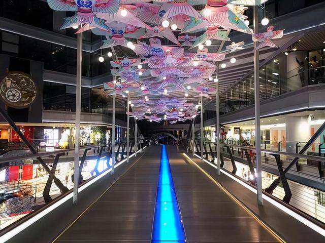 这座现代气息浓郁的绿色建筑,如同充满文化气息的美术馆。建筑结构天马行空,设计作品随处可见。阳光从倾斜的透明屋顶洒落,236米长的亚洲最长室内步行吊桥贯穿整个空间。