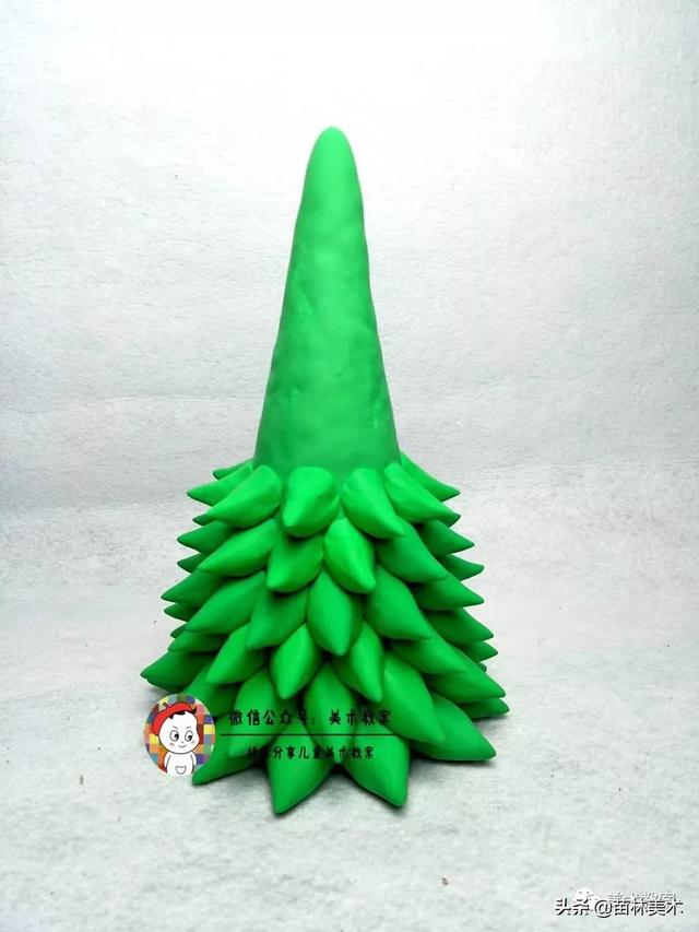 2、把绿色轻质泥捏成许多个小小的尖角的小刺一层一层黏在之前包好的圆锥上。