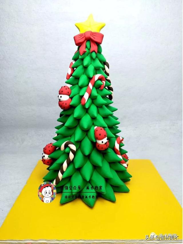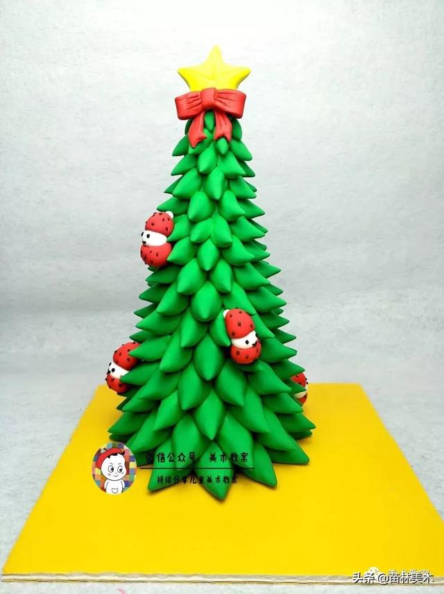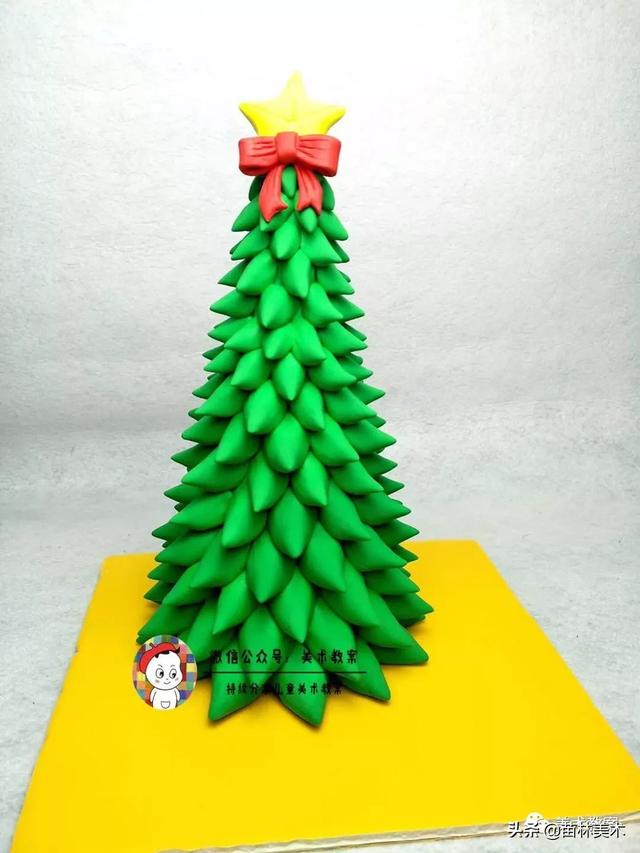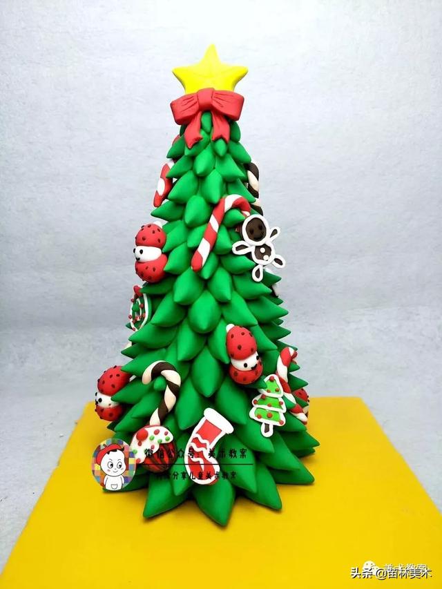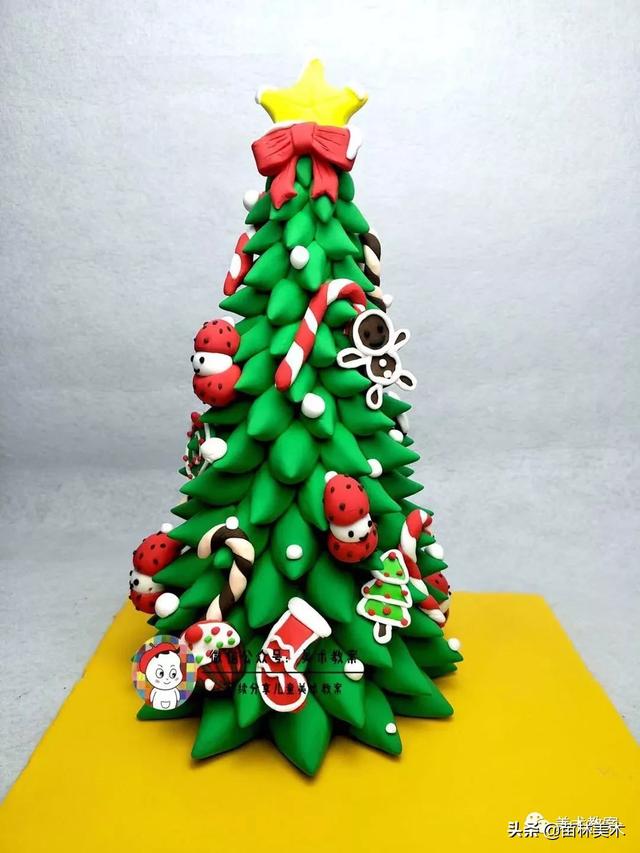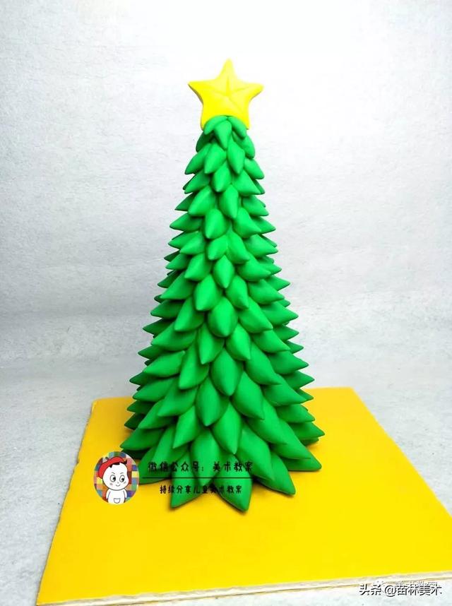4、用黄色轻质泥捏出一个五角星,粘在树最顶端。
