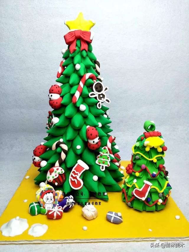 11、用不同颜色的轻质泥做出许多不同颜色和大小形状的礼物盒,并用白色轻质泥在礼物盒上做出丝带和蝴蝶结(蝴蝶结可只做大一些的礼物盒),把做好的礼物盒按照堆起来的和散落的粘在黄色底板上,用白色轻质泥在黄色底板上做出一些小雪球和雪堆,礼物盒上也可以放两三个雪球。漂亮的圣诞树完成了。