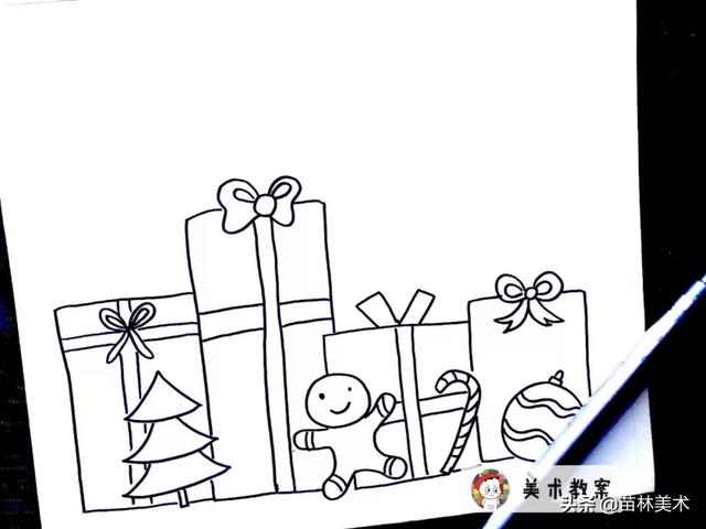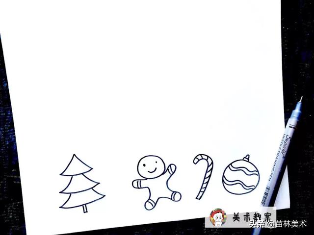 1、勾线笔画画面最前面的圣诞树、姜饼人、圣诞球等圣诞节相关事物。