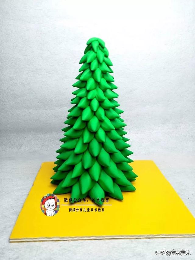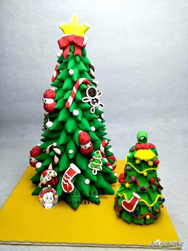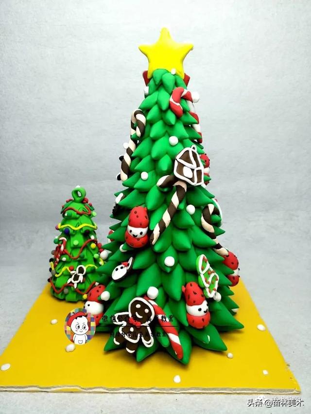 10、把小的圆锥也包上绿色轻质泥,并做出不同第一种的圣诞树叶,并装饰好小圣诞树,把装饰完成的小圣诞树也放到黄色底板上。