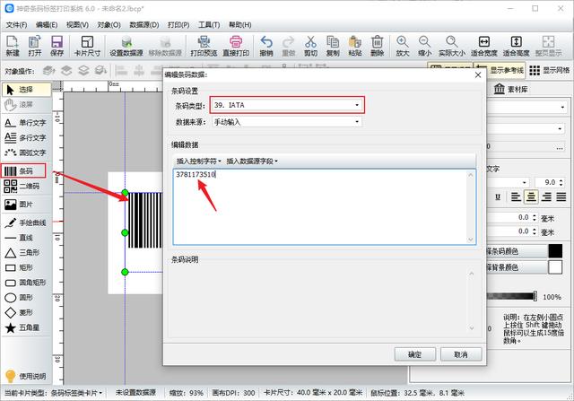 首先打开条码标签软件,新建一个标签,按照标签纸的尺寸设置宽和高。在软件左侧点击“条码”按钮,在画布上绘制一个条形码,在弹出的界面中将条码类型选择为IATA,在编辑数据里输入条码数据。
