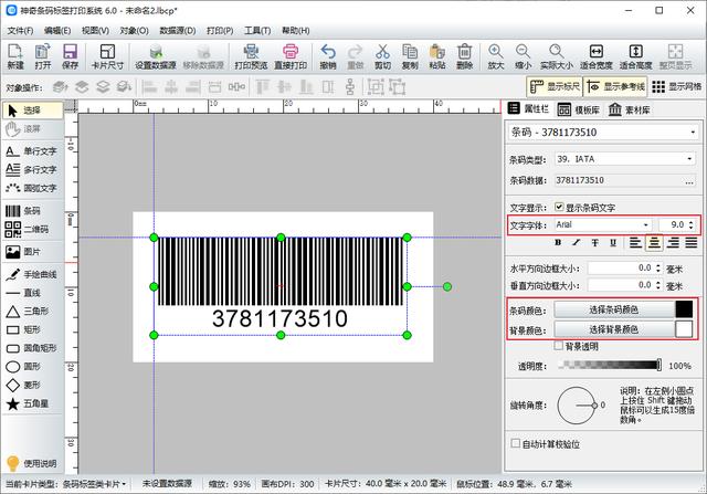 IATA条码生成后,在软件右侧设置条码的文字字体和字号,还可以设置条形码的颜色和背景的颜色。