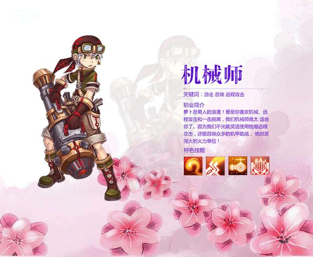 随着王国科技的不断发展,机械师一跃成为了招式中的新星。机动灵活、进攻手段丰富是机械师的特点,要是你喜爱机械、远程进攻和一击脱离,我们机械师就太合适你了。因为机械师不光能灵活使用枪炮远程进攻,还能召唤众多的机甲协战,绝对是强有力的火力单位!