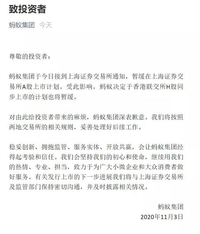 作为主角,蚂蚁集团3日晚间也回应称,对两地暂缓上市给投资者带来的麻烦,蚂蚁集团深表歉意,将按照两地交易所的相关规则,妥善处理好后续工作。阿里巴巴集团发言人则表示︰我们会和蚂蚁集团一起,积极的配合和拥抱监管,我们相信蚂蚁的同学,有这个信心,也有这个能力把工作落实好。社会希望我们更好,我们也必须用一如既往的努力实现和超越社会的期望,这是我们这群人的责任。