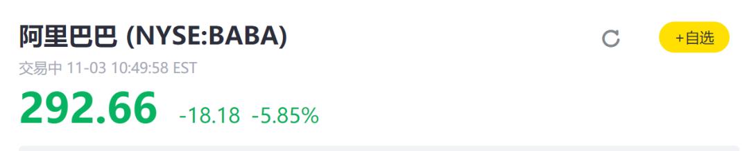 截至3日晚11点50分,阿里巴巴股价报292.66美元,跌幅5.85%。