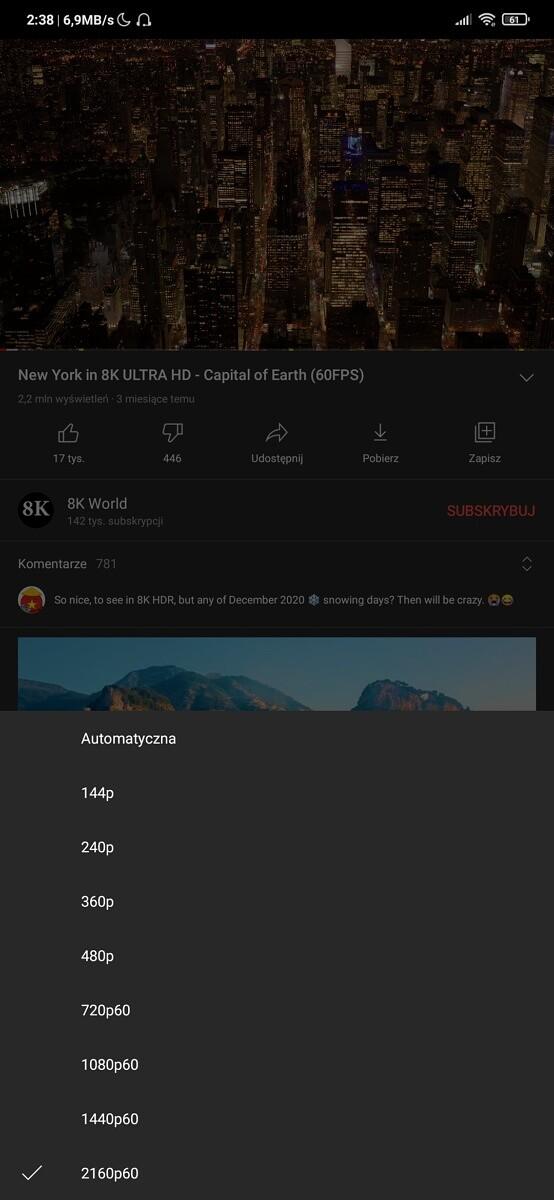 根据YouTube子Reddit上的一些帖子,考虑到拥有4K显示屏的智能手机并不丰富,安卓版的YouTube应用现在可以让你播放4K视频,即使你没有支持4K分辨率的手机。一位Reddit用户u/Liskowskyy分享了一张截图,显示了所有的视频分辨率选项,无论你的手机分辨率如何,都可以达到2160p。