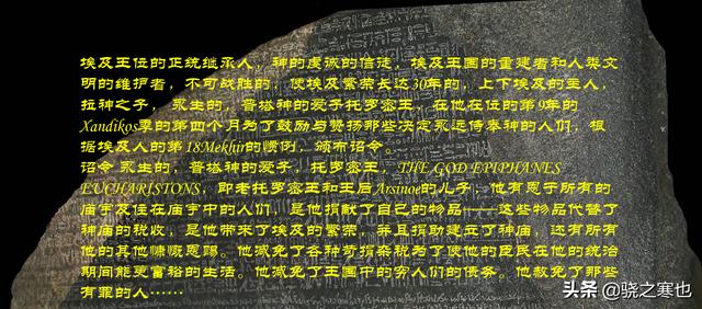 笔者只贴出了内容的一少半,后面还有一大半就不写了,总之这段诏令就是统治者被封神的证明:法老托勒密五世上台颁布了一道法令,就是赐给神庙免税权。同时记录了该法老的功绩,比如修水坝、赏赐物品及粮食等等。祭司们还把法老的生日定为国家的国家的法定节假日。