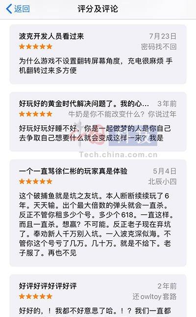 然而,中国网科技记者在各大第三方投诉平台发现,针对波克城市捕鱼游戏“涉嫌赌博”、“诱导儿童消费”等问题,此前已有大量投诉。尤其是在这款游戏苹果手机版本的APP Store评论区,从两三年前开始,就有大量玩家将之称为“赌博游戏”,并声称自己是这款游戏受害者,而最近一条与之相关的评论是在今年5月,评论中明确提及该游戏存在“中间商租号”的情况,并声称自己“玩了6年,天天输”。