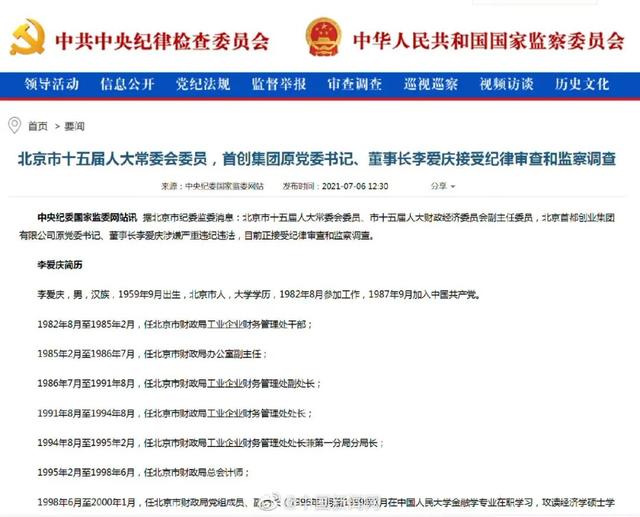 7月6日,据北京市纪委监委消息:北京市十五届人大常委会委员、市十五届人大财政经济委员会副主任委员,北京首都创业集团有限公司原党委书记、董事长李爱庆涉嫌严重违纪违法,目前正接受纪律审查和监察调查。