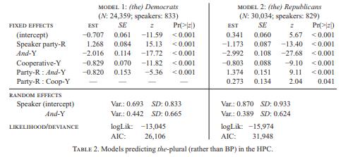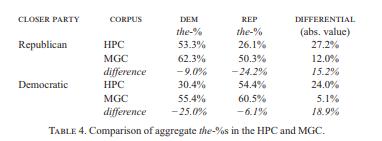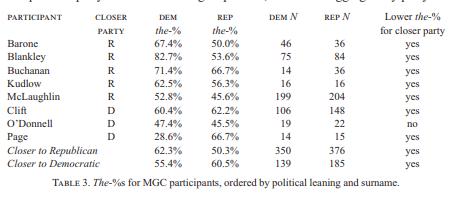 例如,虽然民主党人用the Republicans称呼共和党人的几率为54.4%,但他们在提及民主党人用“the”的比例为30.4%。这些数字对于共和党人来说是相似的 - 当众议院议员谈论民主党人时这一数字为53.3%,而当他们谈论自己政党成员时则为26.1%。