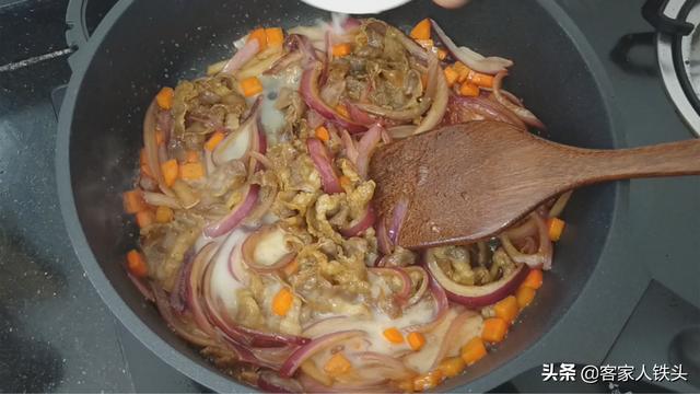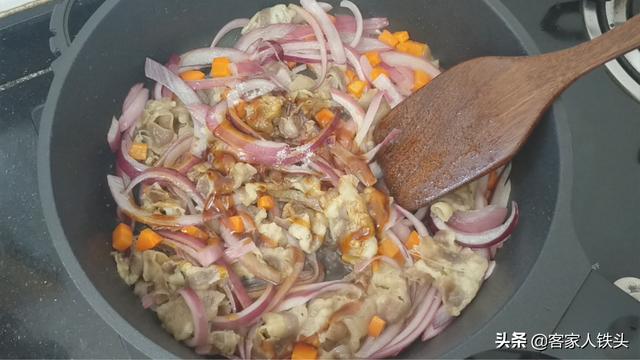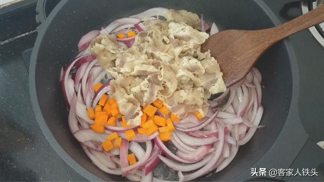 第三步:准备一个小炒锅,平底锅也行,锅中下少许花生油,把油烧热,油热后倒入洋葱丝,调大火把它炒软,炒软后倒入胡萝卜和沥干水分的肥牛,把它翻炒均匀。