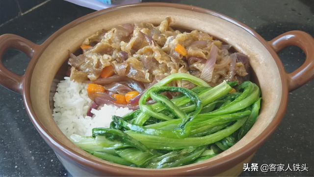 第七步:最后准备一些自己喜欢吃的青菜,这一锅美味的肥牛盖浇饭就做好了,喜欢的朋友试一下,没有小砂锅的朋友,可以用个盘子,倒扣一碗饭,再浇上做好的肥牛和汁,加入青菜就可以了,也很有卖相的哦,小朋友最喜欢这样吃了。