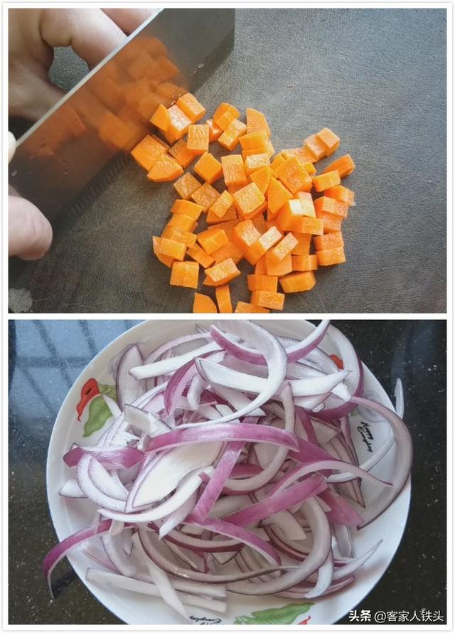 第一步:先准备一个胡萝卜和洋葱,把它们清洗干净后,胡萝卜去皮切粒,洋葱切成丝,喜欢吃粒的也可以切小粒,很多人说切洋葱是边切边流泪,今天我告诉大家一个小秘密,那就是戴着泳镜来切,切再久都不流泪。