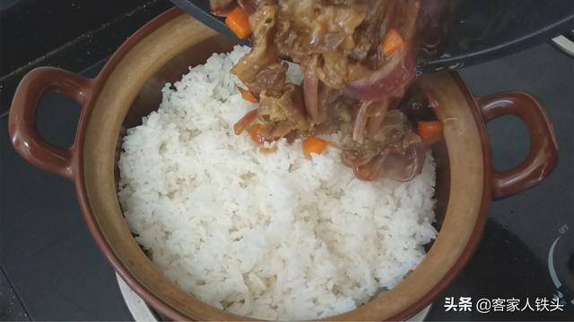 第六步:准备一个砂锅,把它稍微加热一下,锅热后关火,加入刚煮好或蒸好的大米饭,把饭铺平,然后倒入我们做好的肥牛,连汁一起倒进去。