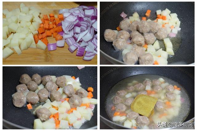 3、炒锅上火烧热,放食用油,放土豆丁、胡萝卜丁、部分洋葱丁放到锅里翻炒出香味,再放牛肉丸翻炒,加清水没过食材,放咖喱块在锅里;