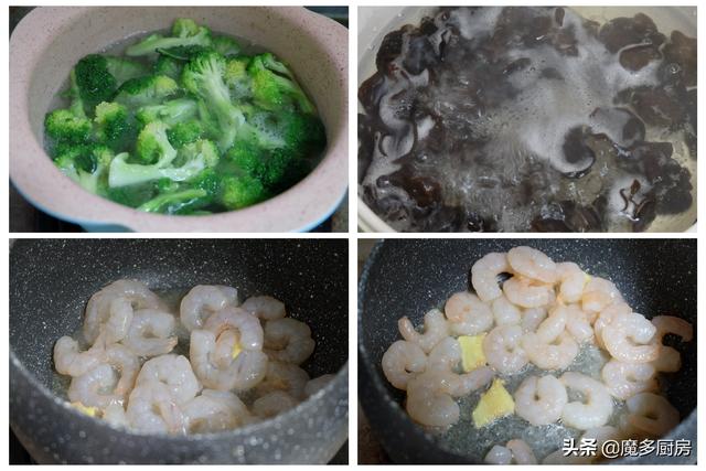 5、炖煮咖喱牛肉丸的时间,可以用来制作木耳虾仁西兰花。小汤锅烧开水,分别焯熟西兰花和木耳。再用小锅烧热,放食用油,放姜片炝锅,放虾仁炒熟;