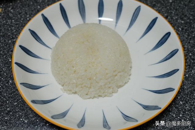 9、盛出一碗米饭到小碗里,压紧实,倒扣在盘子里,一个圆形的米饭包就扣出来了。