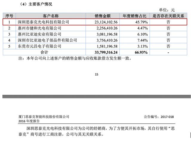 需要说明的是,2018年思泰克光电为公司第二大客户,对其销售金额为1543.64万元,占比为7.89%;2019年销售金额低至44.2万元,系其向公司支付的技术服务及配件销售费用,毛利率达96.60%;2020年、2021年销售数据不详。