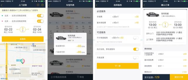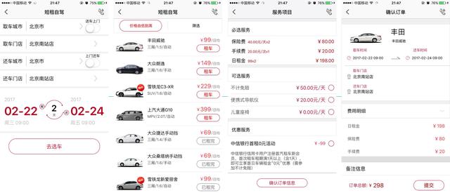 综上,汽车租赁行业主营的自驾租车功能,下单的便捷性一定程度上影响页面跳出率和订单转化率。从三者的功能结构图可以看出,首汽租车和神州租车的自驾租车下单最少需要四步,而一嗨租车三步完成,略有优势。但是在简化下单步骤的同时,每一步骤上的内容其实比较难平衡,首汽租车和神州租车在每一步的操作上基本属于简洁,而一嗨租车明显在最后一步操作上过于繁琐,这就是所谓的鱼和熊掌不可兼得。