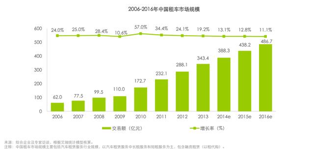 艾瑞咨询最新统计数据显示,中国租车市场处于高速发展期,2013年市场规模343.4亿元,增速19.2%,预计2016年租车市场增速保持在10.0%以上。