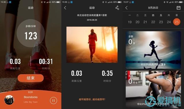 运动:显示运动的步频、运动距离和运动时间,运动结束后会给出运动的统计信息,可以在下面的图中看到界面非常漂亮。