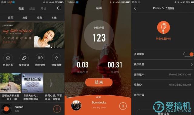 耳机:这个菜单下可以设置耳机的各项参数,包括是否开启步频换歌,是否开启时间、计步等语音提示。如果有新推出的固件可以在这里进行更新升级。