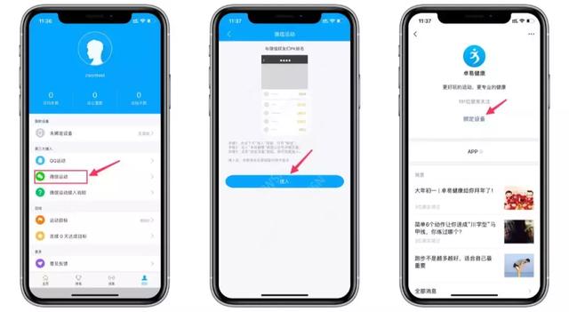 登陆完成,点击软件右下角的「我的」按钮,来到相关界面,界面中的第三方接入区域内可以看到「微信运动」按钮,点击后软件会指导你整个刷步流程怎么才操作。其实非常简单,在这个页面里点击「接入」,就会自动跳转到微信让你关注公众号,并且绑定自己到设备。