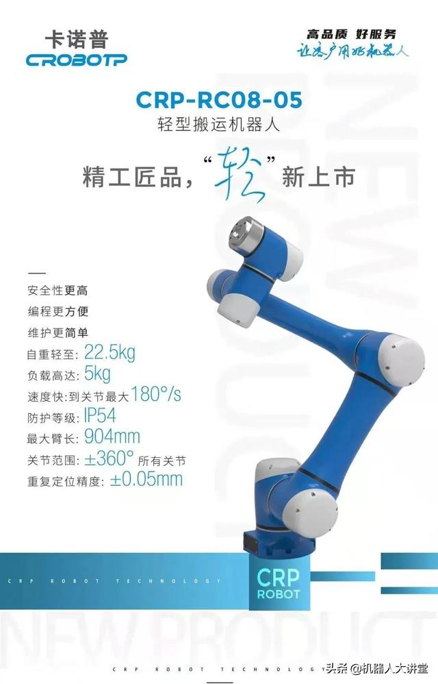 机器人大讲堂1月25日,近日,卡诺普正式发布CRP-RC08-05轻型搬运机器人。据了解,卡诺普CRP-RC08-05轻型搬运机器人自重较轻,负载却高达5kg,具有领先的速度,重复定位精度高等优势,适用于快速搬运和摆放任务需求,尤其是适用于物流行业,可进一步提高物料分拣和搬运的速度。