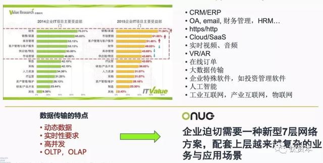 SD-WAN的企业价值体现,根据Value Research发布的2014年和2015年IT主要的受益部门,其中销售市场、客户管理、财务提升非常快,这说明企业面对业务场景时要把大部分资源放在前线部门,应用有CRM、ERP、OA、Email、财务管理、HRM、Https、Http、Cloud、SaaS、实时的音视频、VR、AR、在线订单、大数据传输以及企业特殊软件如投资集团的投资管理类软件等,还有逐渐出现的人工智能、工业互联网、产业互联网、物联网等等。