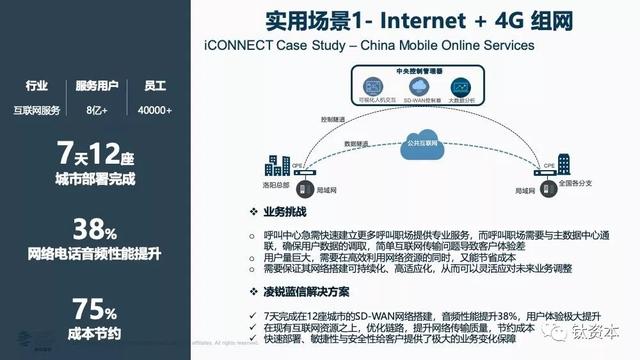 第一个场景是典型低成本的Internet+4G组网。现在大集团的很多呼叫中心,其业务挑战是:首先要尽可能快的建立呼叫组网,快速把团队建起来提供服务,建得慢就会被竞争对手抢先提供服务;其次呼叫组网都放在四五线的城市,因为当地的人工成本低。而每个呼组网可能有几十、上百人的规模,如果为了呼叫组网与主数据中心通讯而建个数据中心或租数据中心专线,不仅没有业务敏捷力而且成本也是问题。