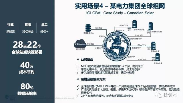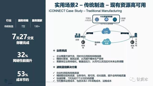 有两个点值得注意,首先是“新型网络方案”,指的就是“七层网络方案”,现在经常使用的网络主要是三层网,包括MPLS、Internet专线和物理专线,那IEPL就是二层网;其次“配套上层越来越复杂的业务与应用场景”,这应该是ICT领域发展到现在第一次出现要求网络配套上层的应用和业务,而SD-WAN可以满足这一需求。